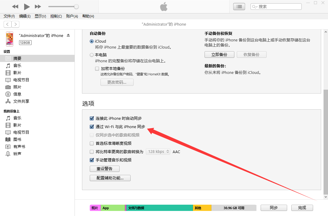 7.打开 iTunes,然后在设备上启用“通过 Wi-Fi 与此 iPhone 同步”