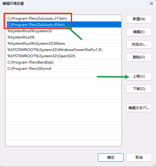 可以看到,在名为“编辑环境变量”的界面中,我安装包安装的两个 Java(zulu 8 和 zulu 21)都有环境变量(红框部分)。